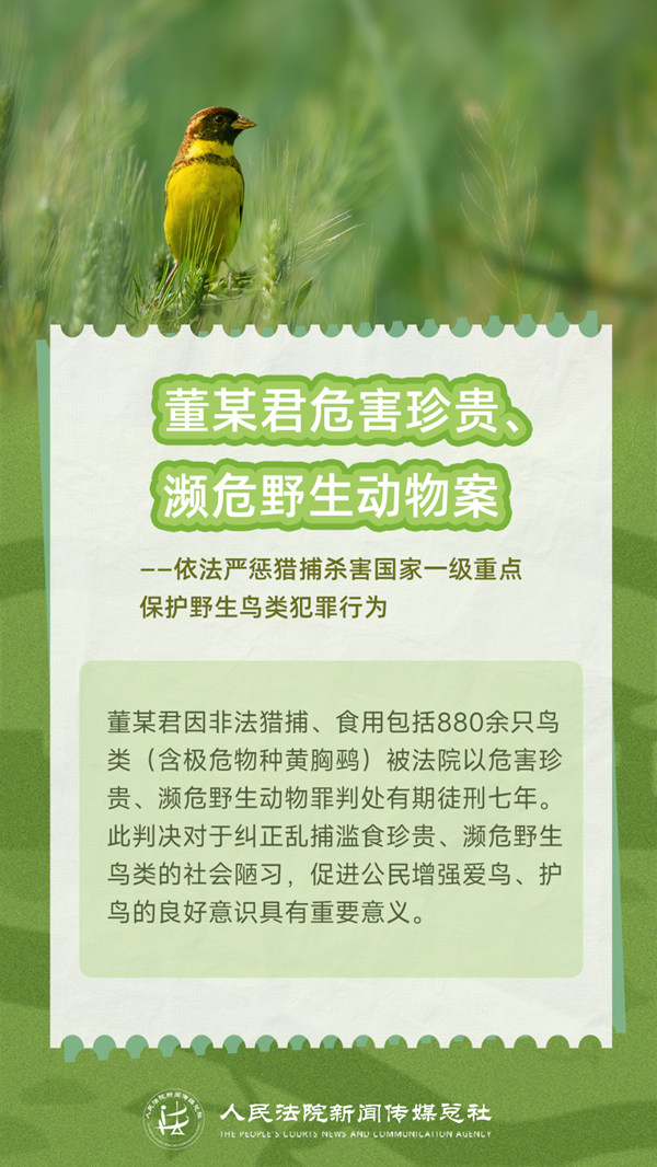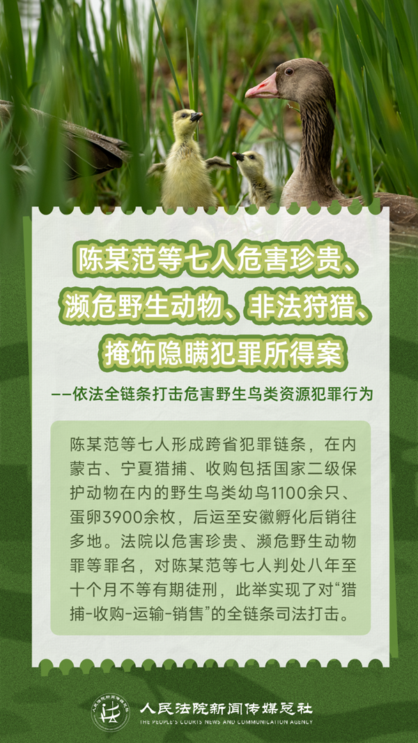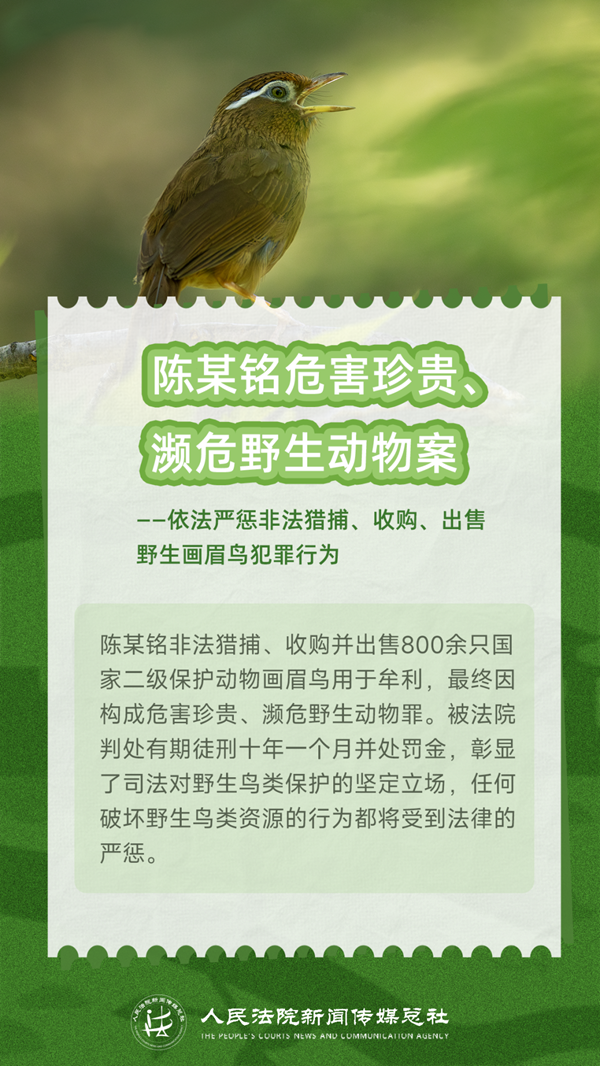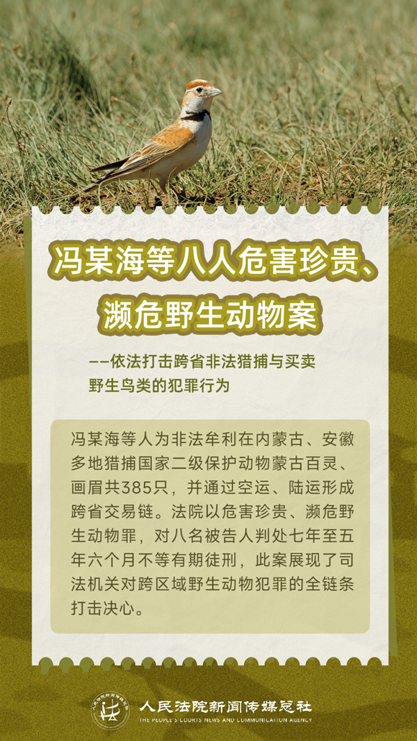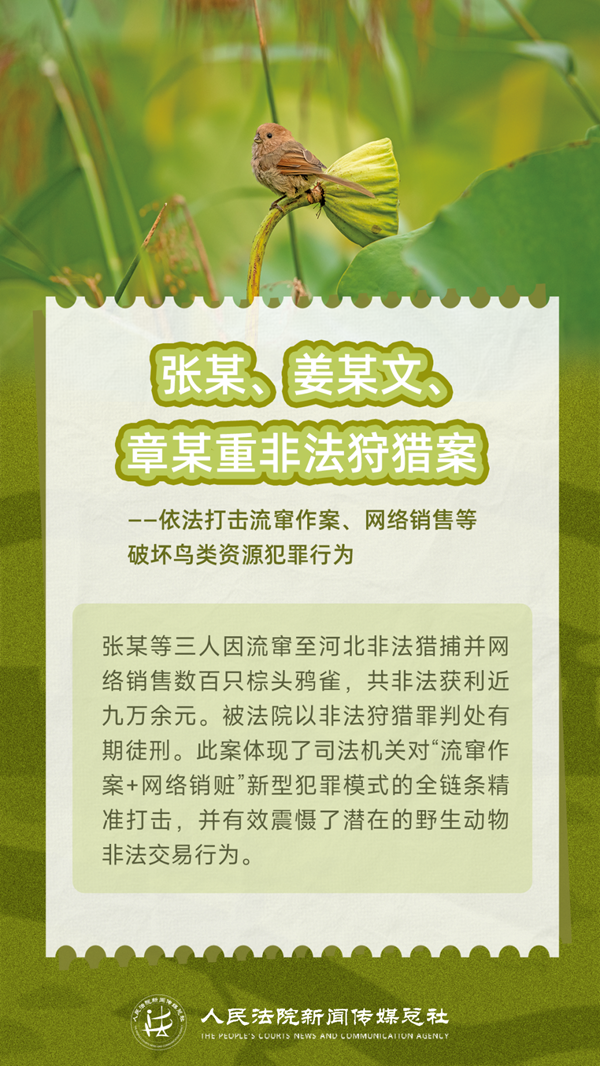 每一对被网罗的羽翼,都会对生物多样性造成伤害。当捕鸟、售鸟不再是“小事一桩”,而是触碰法律红线的犯罪行为,我们该如何转变认知、规范行为?让我们通过五张海报了解非法狩猎、交易野生鸟类的犯罪后果,敲醒法律的警钟,增强爱鸟护鸟意识,一同守护空中的自由精灵,捍卫我们共有的家园。