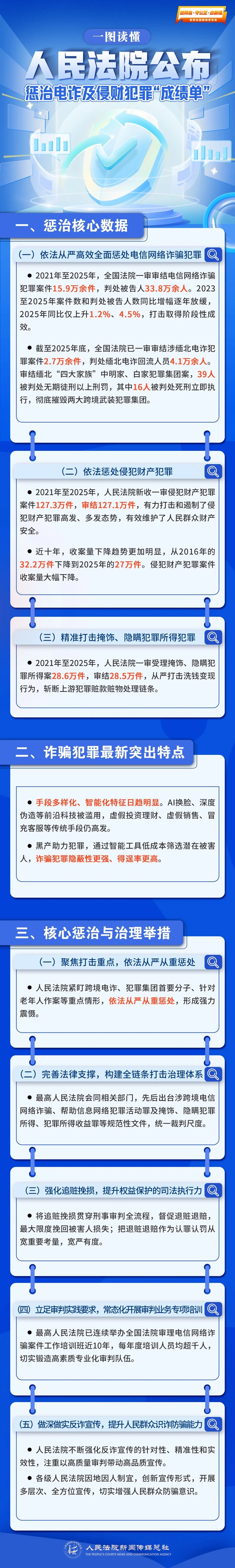 2026年2月26日上午,最高人民法院举行“人民法院依法惩治电信网络诈骗、侵财犯罪工作情况”新闻发布会。发布会上,最高人民法院刑三庭庭长汪斌与刑四庭副庭长司明灯,分别介绍了近年来人民法院依法惩治电信网络诈骗犯罪的相关工作情况和人民法院依法惩治侵犯财产犯罪有关情况。重点内容有哪些,带你一图读懂!